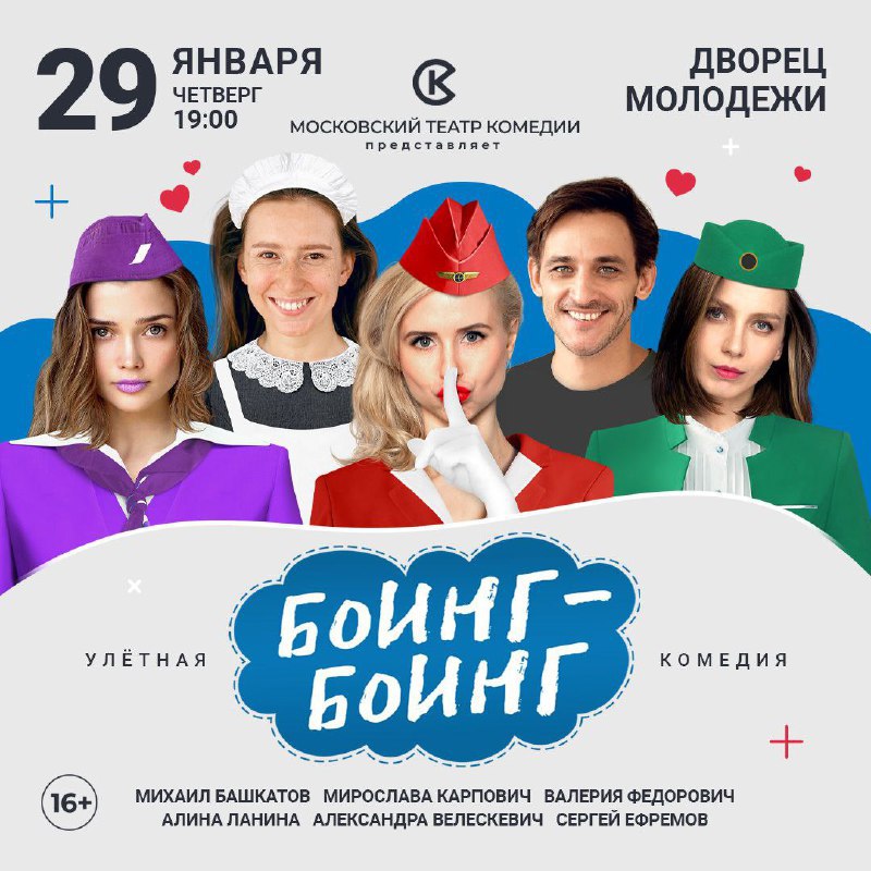 Уже совсем скоро, 29 января в 19:00, вас ждёт комедийный спектакль «Боинг-Боинг», полный веселья, интриг и искромётного юмора! Актёрский состав: - Михаил Башкатов - Мирослава...
